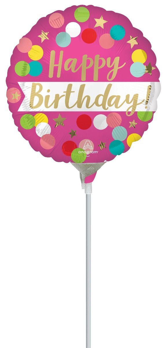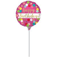 22cm Happy Birthday Satin Pink Confetti Foil Balloon #4045920AF - Each (Inflated, supplied air-filled on stick)