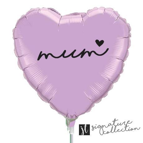 22cm Mum Script Heart Pearl Lavender Foil Balloon #JT1025 (Inflated, supplied air-filled on stick)